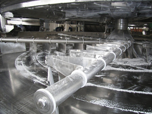濕物料自加料器連續(xù)地加到干燥器上部第一層干燥盤上,帶有耙葉的耙臂做回轉(zhuǎn)運(yùn)動使耙葉連續(xù)地翻抄物料。物料沿指數(shù)螺旋線流過干燥盤表面,在小干燥盤上的物料被移送到外緣,并在外緣落到下方的大干燥盤外緣,在大干燥盤上物料向里移動并從中間落料口落入下一層小干燥盤中。大小干燥盤上下交替排列,物料得以連續(xù)地流過整個(gè)干燥器。中間的干燥盤內(nèi)通入加熱介質(zhì),加熱介質(zhì)形式有飽和蒸汽、熱水和導(dǎo)熱油,加熱介質(zhì)由干燥盤的一端進(jìn)入,從另一端導(dǎo)出。已干物料從最后一層干燥盤落到殼體的底層,最后被耙葉移送到出料口排出。濕份從物料中溢出,由設(shè)在頂蓋上的排濕口排出,真空型盤式干燥器的濕氣由設(shè)在頂蓋上的真空泵口抽出。從底層排出的干物料可直接包裝。通過配備翅片加熱器、溶劑回收冷凝器、布袋除塵器、干料返混機(jī)構(gòu)、引風(fēng)機(jī)等輔機(jī),可提高其干燥的生產(chǎn)能力,干燥膏糊狀和熱敏性物料,可方便地回收溶劑,并能進(jìn)行熱解和反應(yīng)操作。